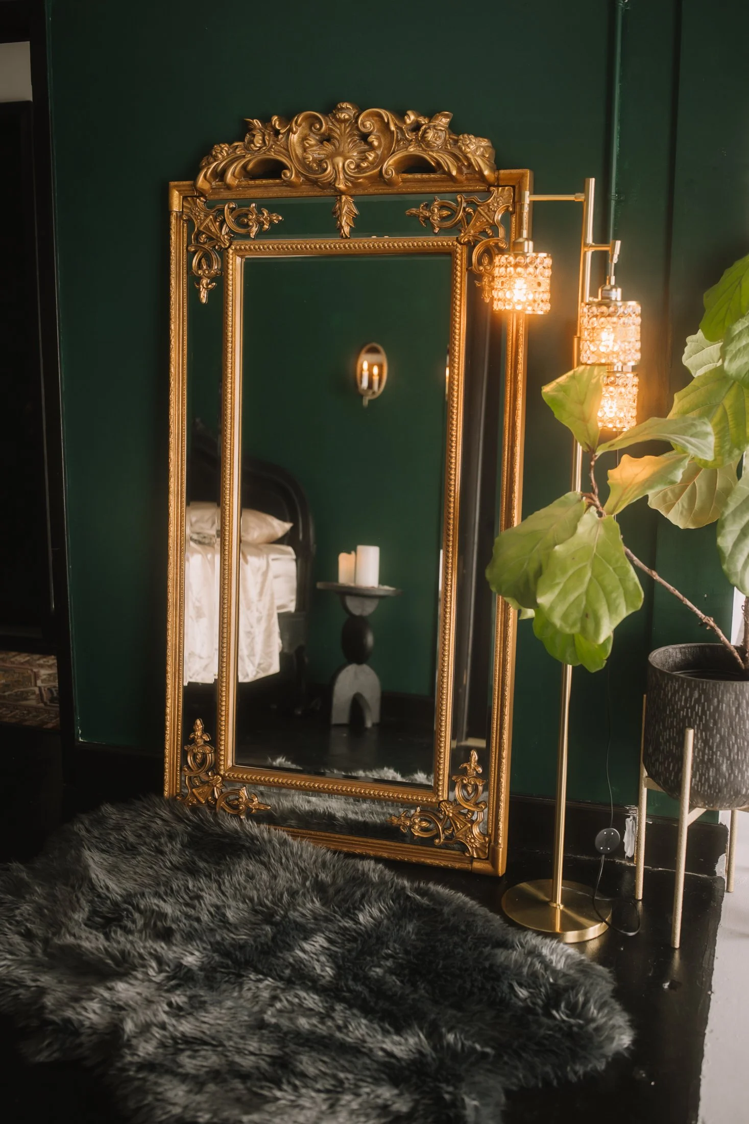 My iconic curved velvet teal sofa and moody dark wall set