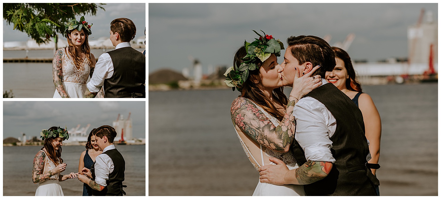 Ren and Jai’s Davis Islands wedding in Tampa included only their nearest and dearest. They had a simple and sweet waterfront ceremony at the park with a spectacular view of Hillsborough bay and the Port of Tampa. An eclectic view combining beauty and industry. You don’t always need a huge venue that provides chairs and an arch to say have a ceremony. Ren and Jai had everything they wanted and needed to become wife and wife. Ren’s flowing a-line v-neck wedding dress from Forever Bridal stole the show. Her laurel wreath headpiece with red accent flowers completed the look allowing me to capture her artistic spirit. Jai wore stylish deep blue pants and a floral tie that complimented Ren flawlessly. Her infectious smile projected her love for the day and her future wife, radiating to everyone in attendance.