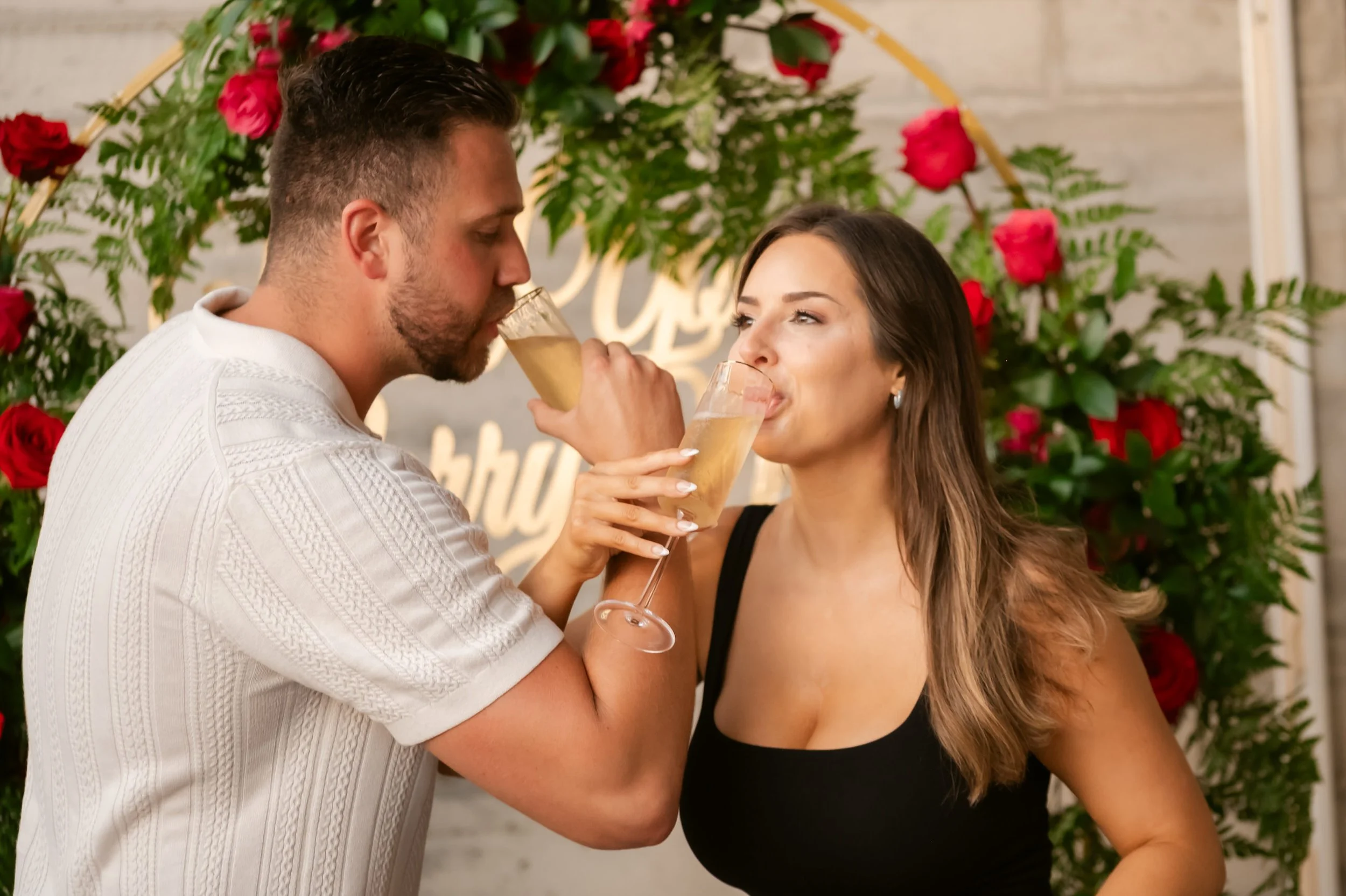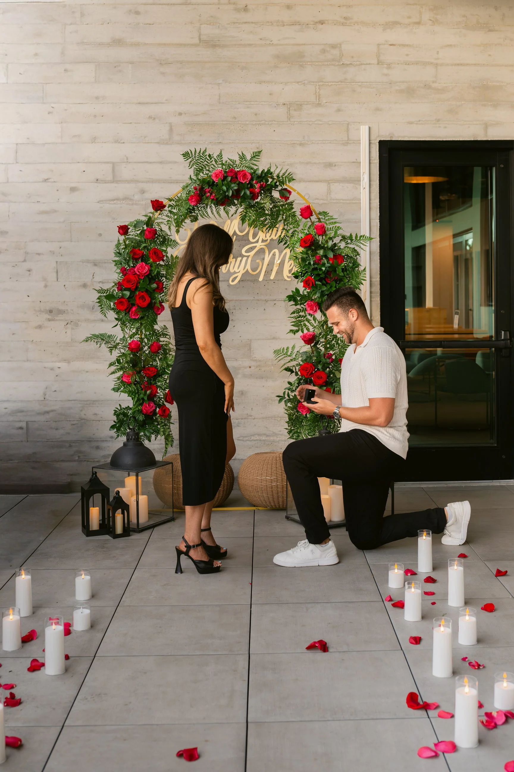 When Bridgette walked into Hyde House in the heart of Hyde Park, Tampa, she welcomed with candlelight and red rose petals. She immediately started balling her eyes out! Cameron didn't just propose — he created an entire moment. A table filled with photos of their relationship, custom cookies stamped with the date, champagne on ice, and a stunning floral arch of deep red roses framing a gold sign that asked the only question that mattered: Will you marry me? Her answer, obviously, was yes.